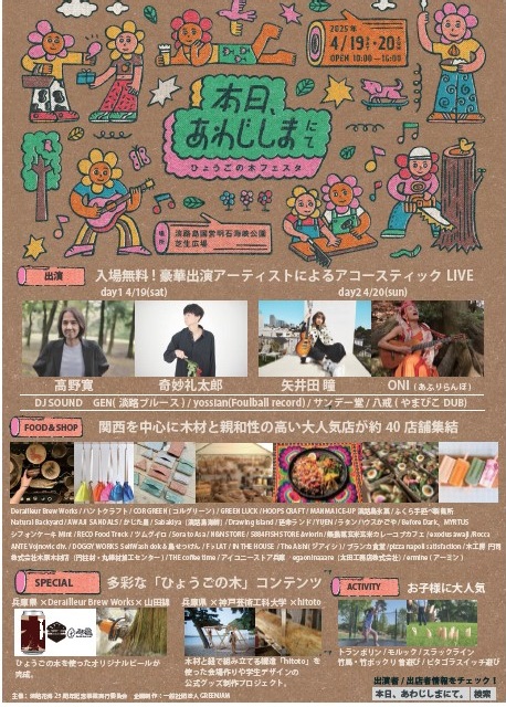 淡路花博25周年記念事業実行委員会が主催するひょうごの木フェスタ「本日、あわじしまにて。」において、森や木の良さを体感できるワークショップを兵庫県と大学生とのコラボにより出店し、ほかにも木の良さを五感で体験できるプログラムを企画していますので、ぜひご参加ください。(詳細はこちら)