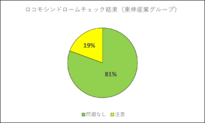 今回のチェックでは、各事業所ごとに結果を集計し、全体の傾向を円グラフでまとめました。さらに、就業中に運動機能のチェックができる機会を設け、転倒などのリスク評価も行いました。